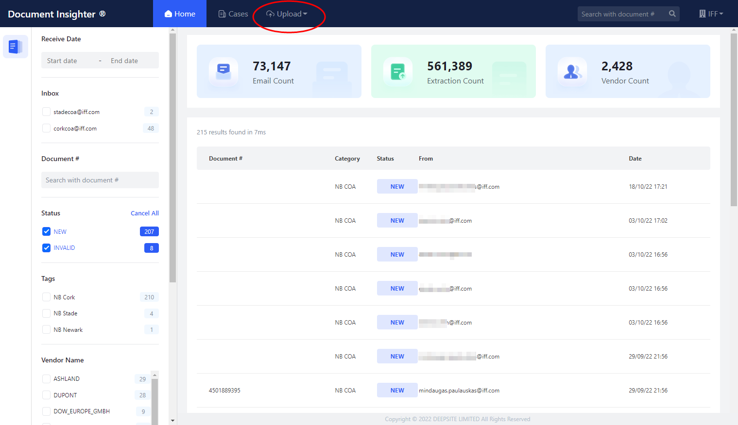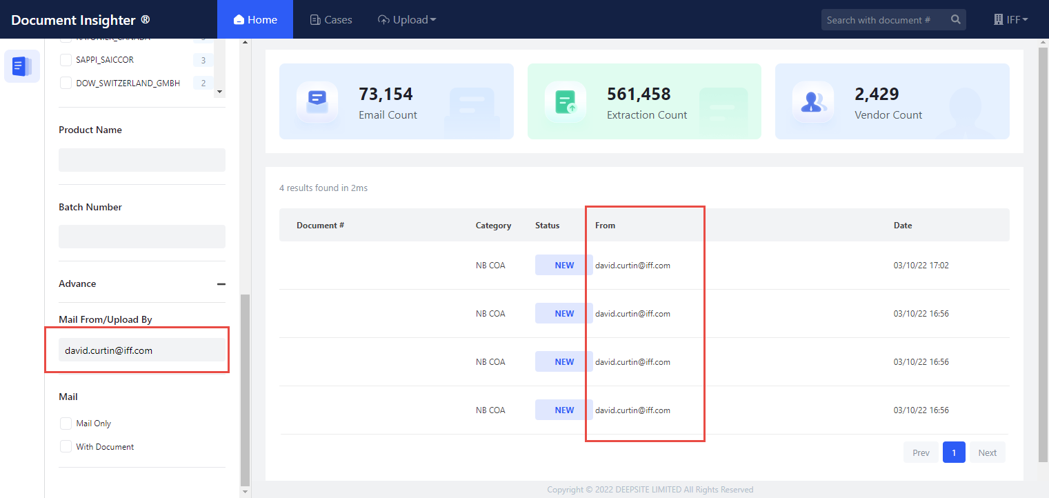 - “Mail From/Upload By”: Filter all the extractions by User’s email address.