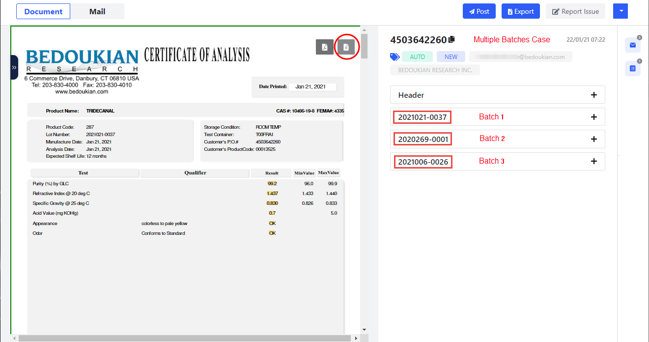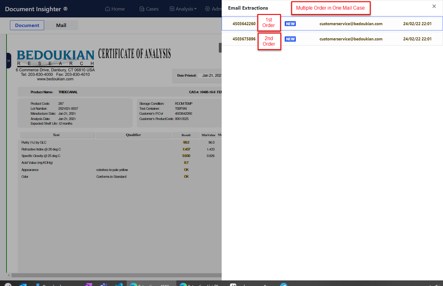 After the system enhancement and upgrating, Document Insighter supports users email or upload COA documents with multiple batches/IPCs/orders/PDF files in a mail now. The system will divide the extraction results from the same email but different orders into different extractions and presented separately on the portal.