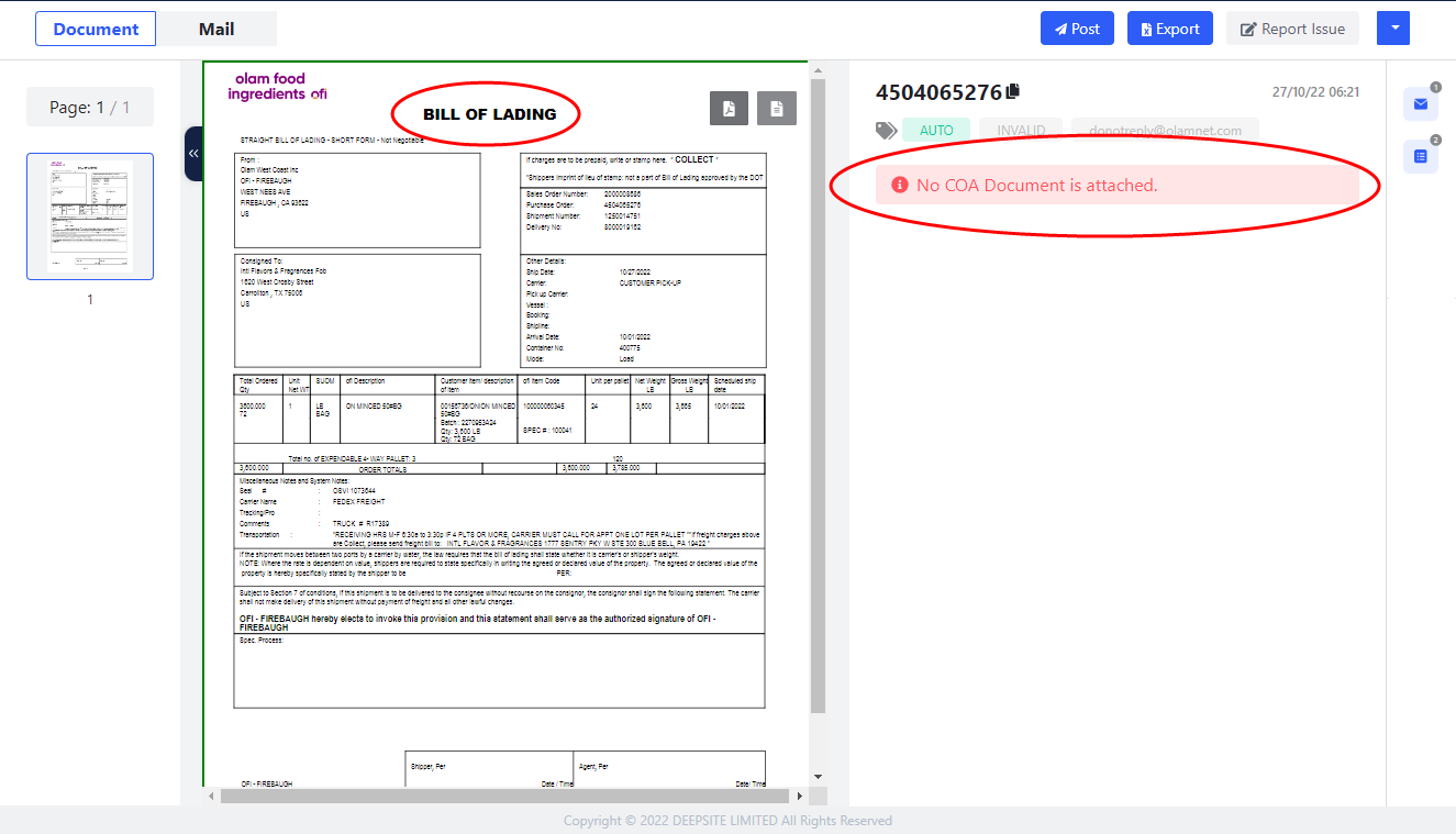 After logging in, the COA document if existed and email will be shown in the left side of the page. User can also down the PDF version of the document file or the eml version of the email by clicking the download button.