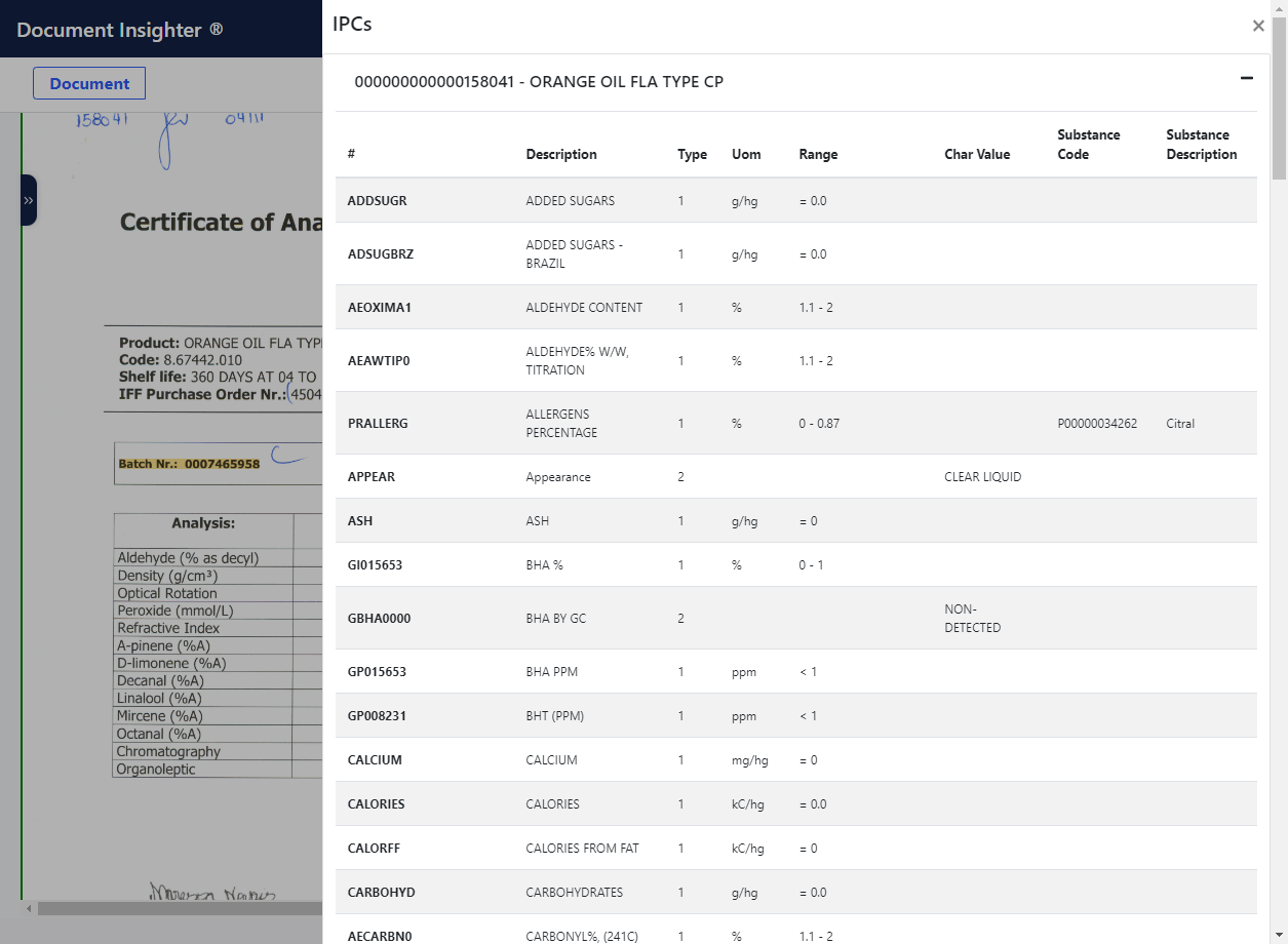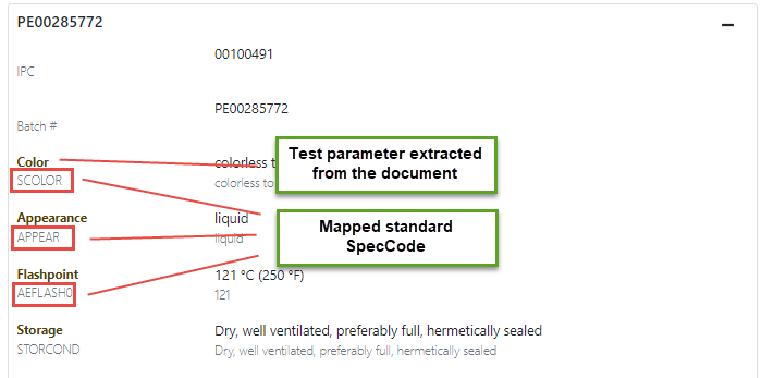 The contents in the following picture with the red box show the extracted test parameters in vendor’s COA document. Our ontology engine will map it to the IFF MIC SpecCode automatically.