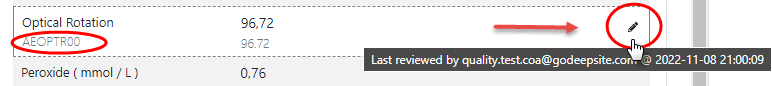 The extracted data will be shown in the right side of the page including Test parameter results and mapped Spec codes. Clicking the button ① in the following picture will display the historical extracted records of the COA: