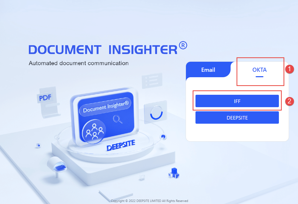 Users can log in the DEEPSITE Insighter portal by clicking button ① “OKTA” and choosing “IFF” and then typing in their authorized account name and password