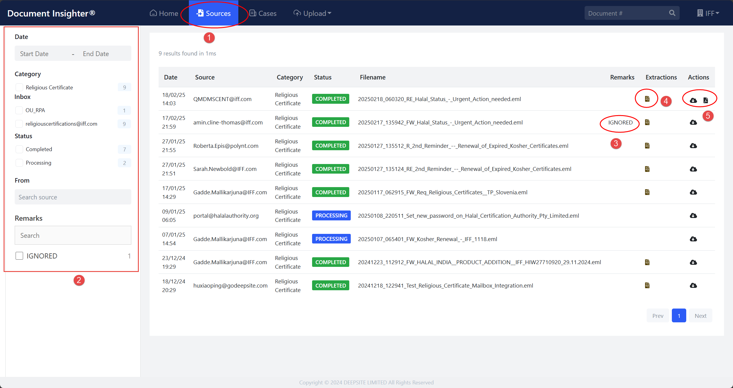 The Sources page provides a comprehensive view of all incoming religious certification documents from different sources like email, RPA tool and manual upload, and their processing status. Access this page by clicking the “Sources” button in the top navigation bar.