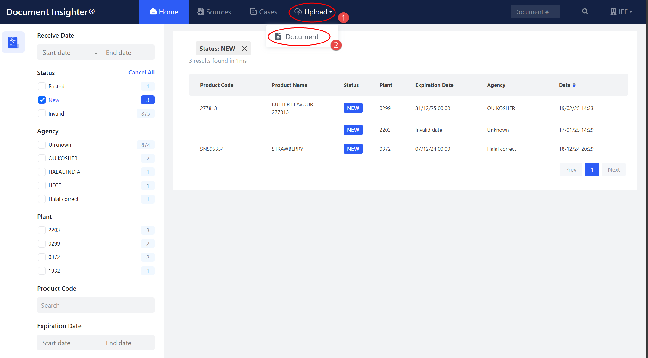 - “Inbox”: Filter by input channels (Email: religiouscertifications@iff.com / RPA tool: Agencies’ Portal Auto Scraping / Manual Upload via Document Insighter)