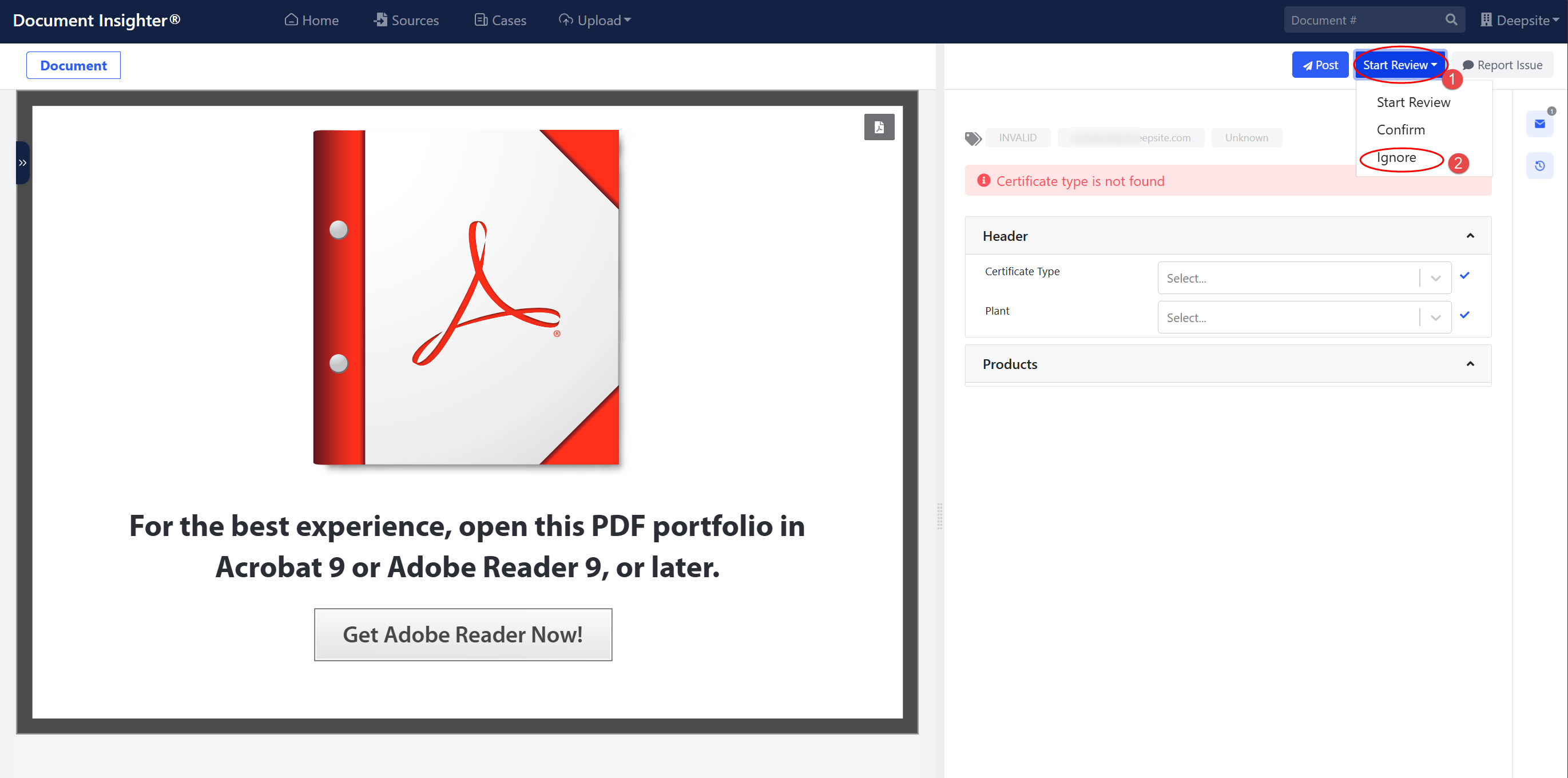 - Directly approve certificate product, status changes to “Reviewed”, and updating the code mapping in Document Insighter portal will be triggered.