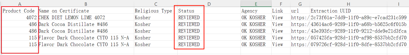 User can edit the exported xlsx file to perform bulk modifications. Type in the IFF product code in the “Product Code” column to update the Status to “REVIEWED”.
