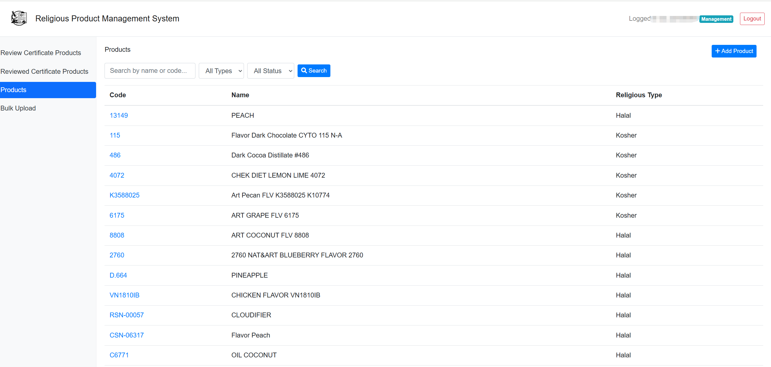 User should be assigned the “Code Management” role to access the system, if not, please raise a ticket (Target Document Type: Religious Certificate) via IFF ServiceNow and leave the comment “Please grant me the Code Management role” to get the access to the Religious Product Management System.