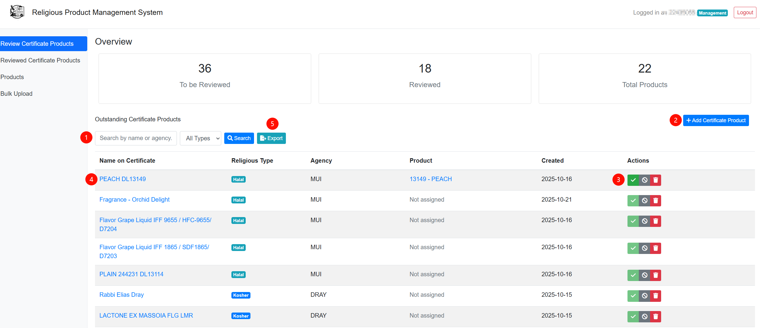 Approve ③: Approve this certificate product and change its status to “Reviewed”. The product will be moved to the “Reviewed Certificate Products” section for final management.